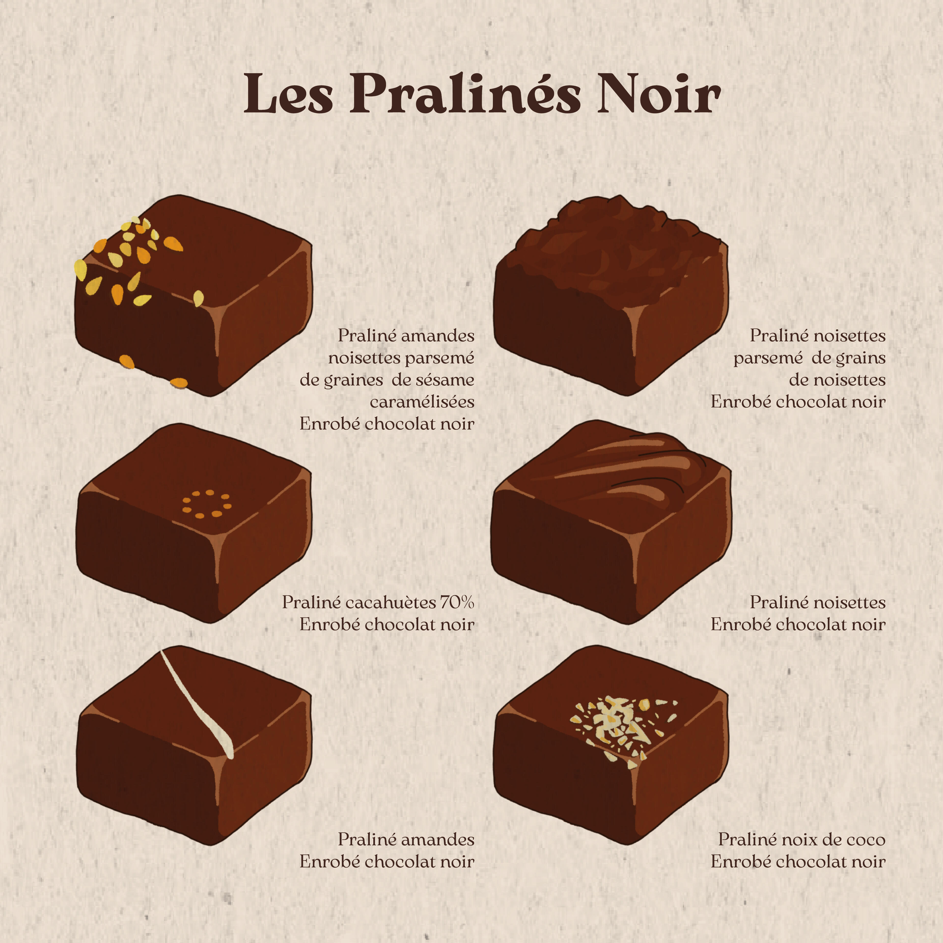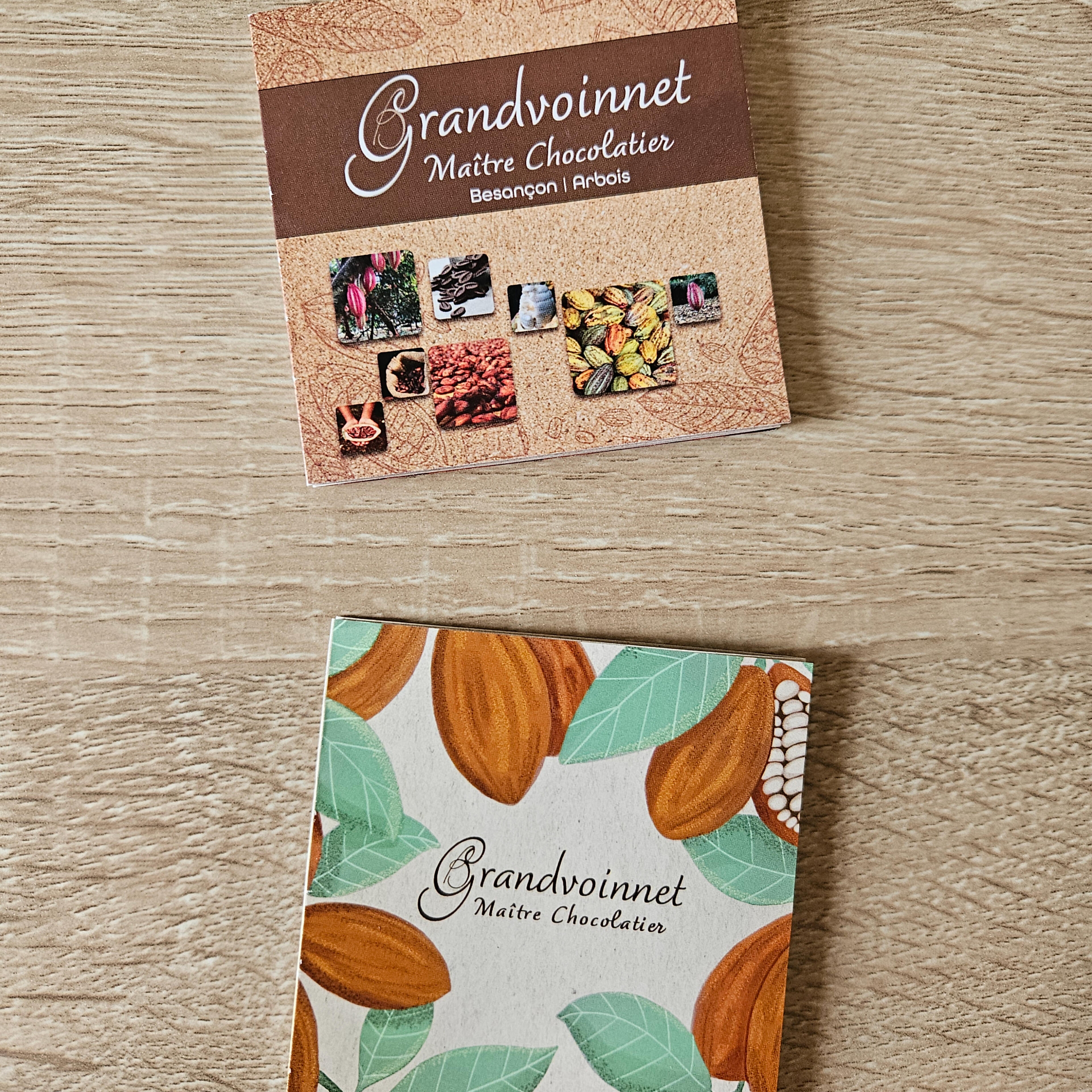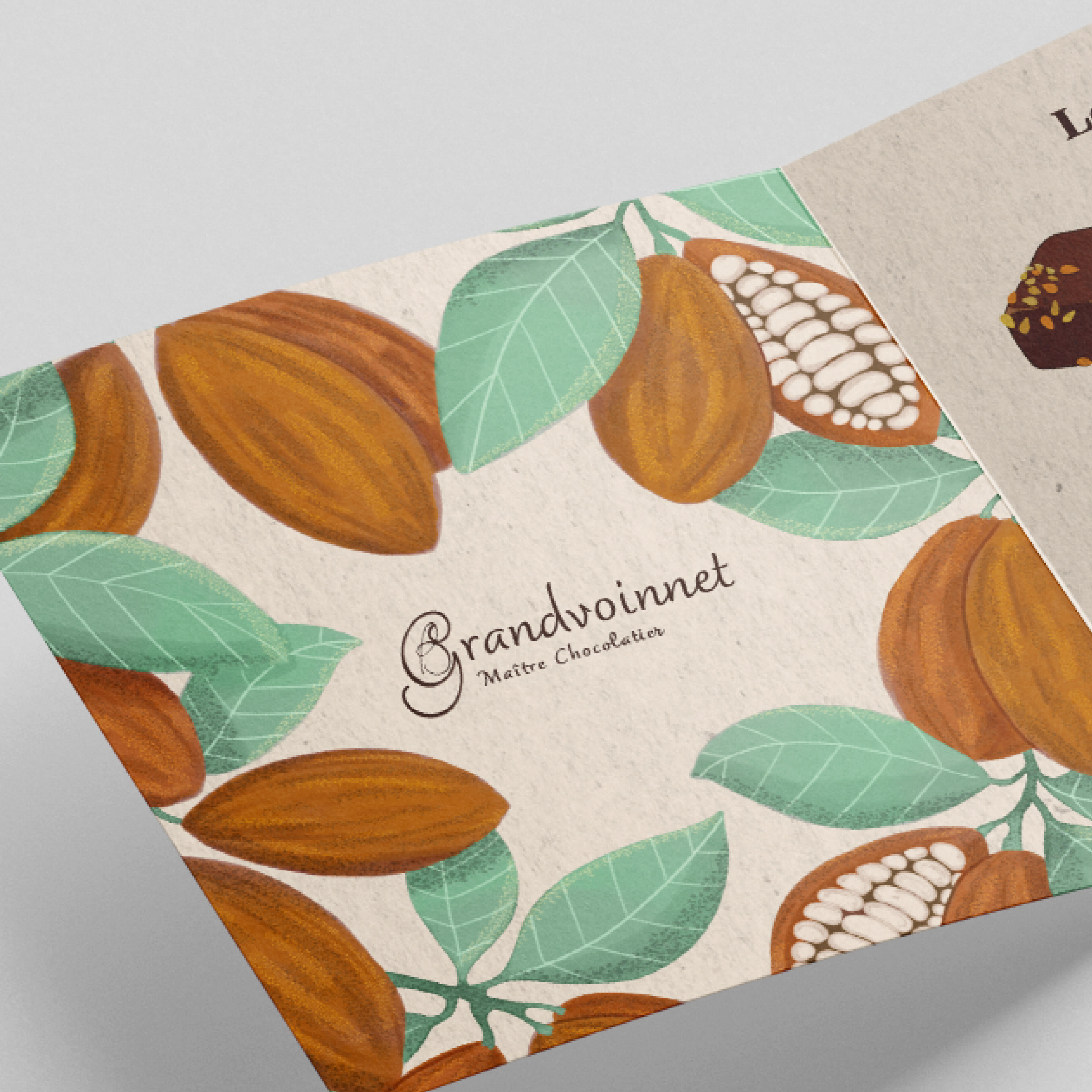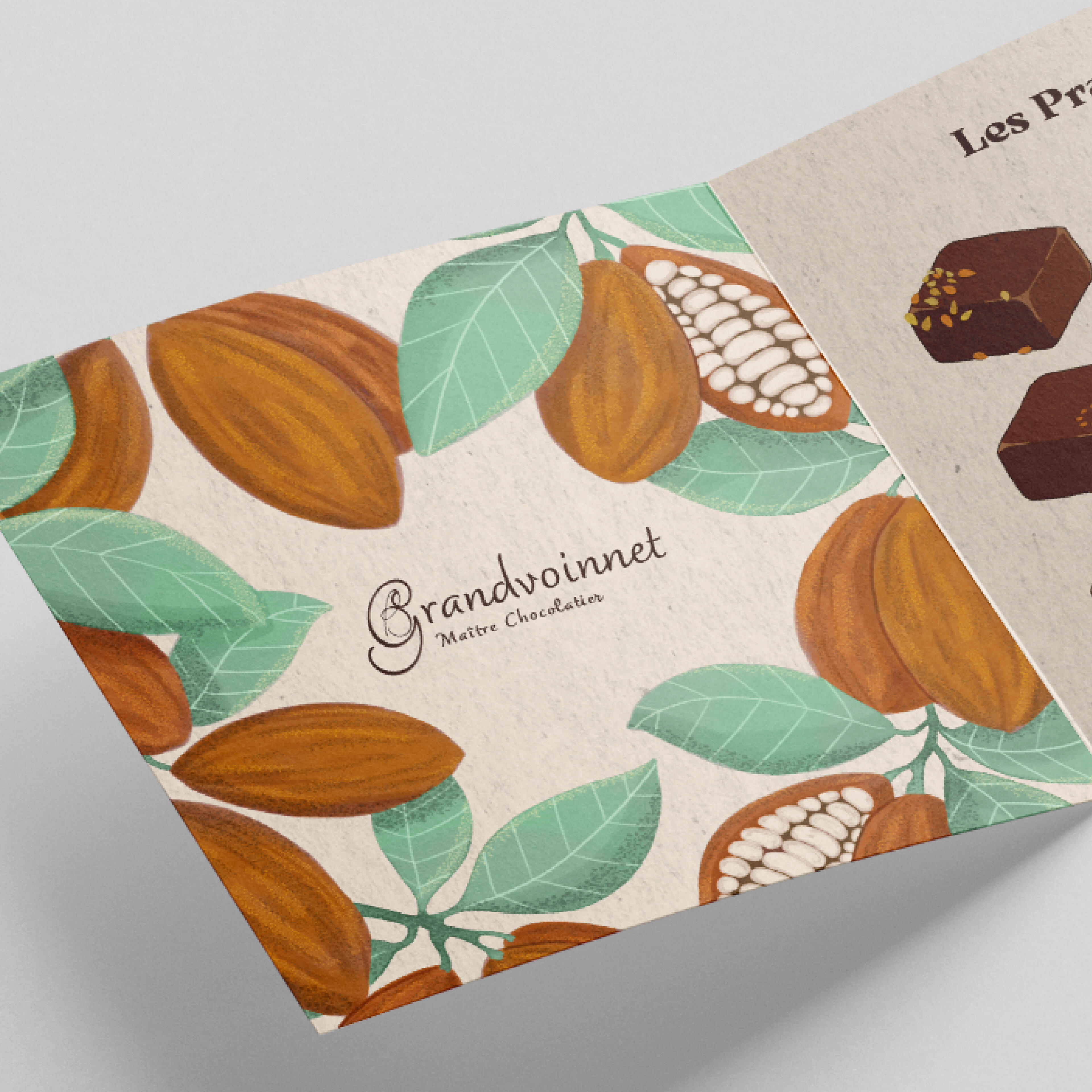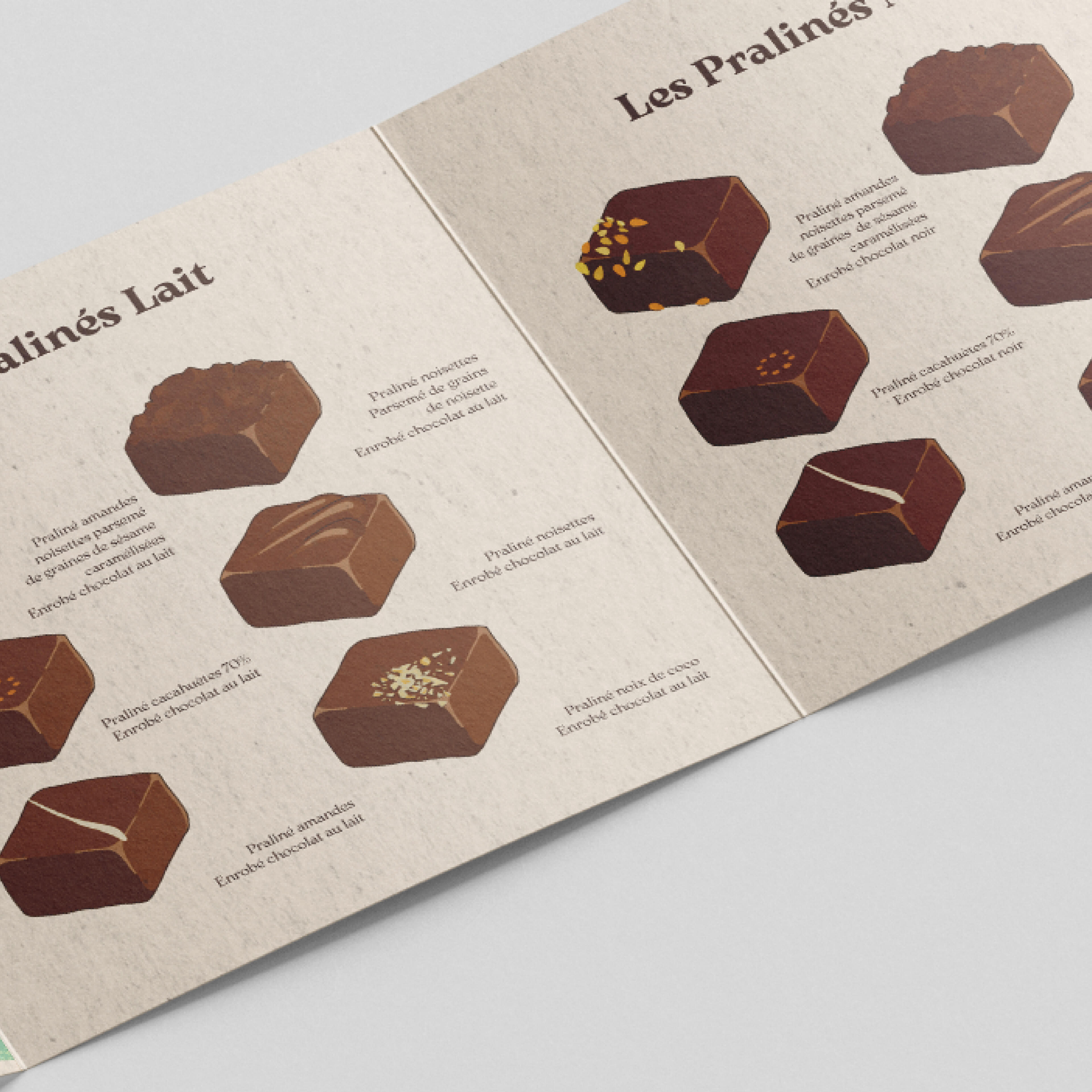 Résultat - Je suis donc parti sur des visuels avec des couleurs plus vibrantes et un contraste augmenté pour mieux discerner le chocolat noir du lait. J'ai également réalisé des illustrations de feuilles de cacaotier et de cabosses pour la couverture et les coins du dépliant. J'ai également reproduit la mise en page de la précédente version du dépliant, en modernisant le tout avec une typo plus classieuse et une organisation plus épurée.