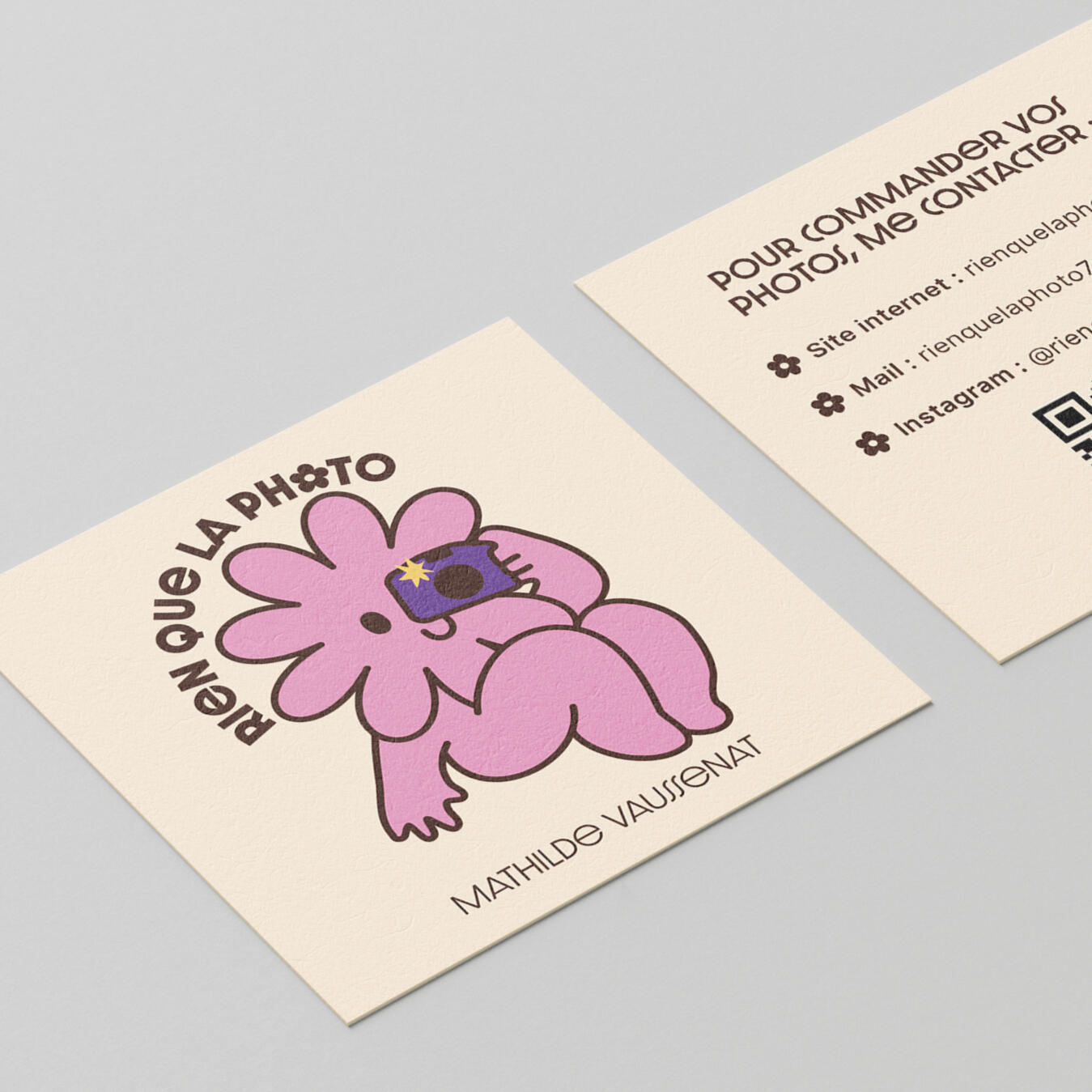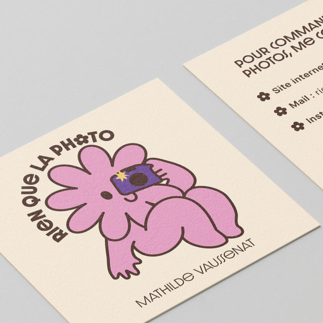 J'ai réalisé une carte de visite, une signature de mail, ainsi qu'une version typographique du logo pour les watermarks. Enfin, j'ai réalisé une courte séquence de transition animée pour les contenus vidéos que Mathilde réalise.