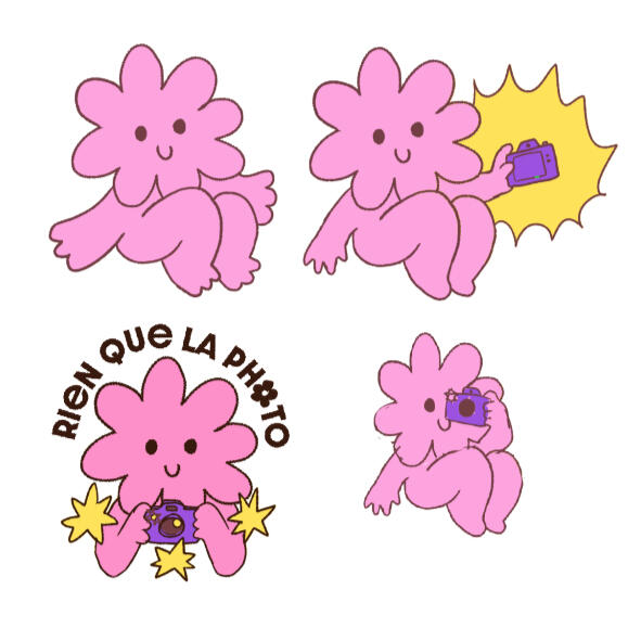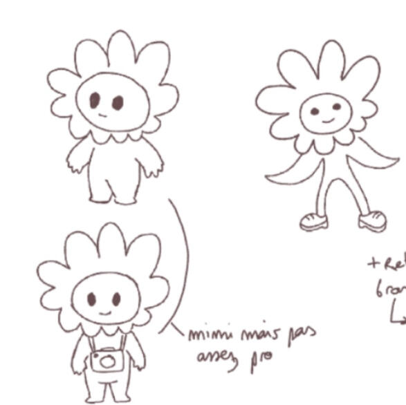 Premières recherches - Dès le départ, Mathilde avait pour idée d'utiliser une mascotte. C'est un choix assez original, encore plus dans la photographie : elle souhaitait que ce petit personnage incarne sa marque, et reflète sa personnalité solaire. Ci-dessous mes recherches papier et à la tablette graphique.
