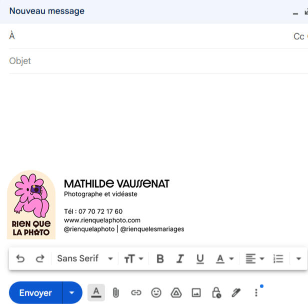 Il m’a accompagnée sur le choix des typos, la création de ma signature mail, et même l’intégration d’éléments graphiques pour harmoniser mon site internet avec la direction artistique qu’il avait imaginée.