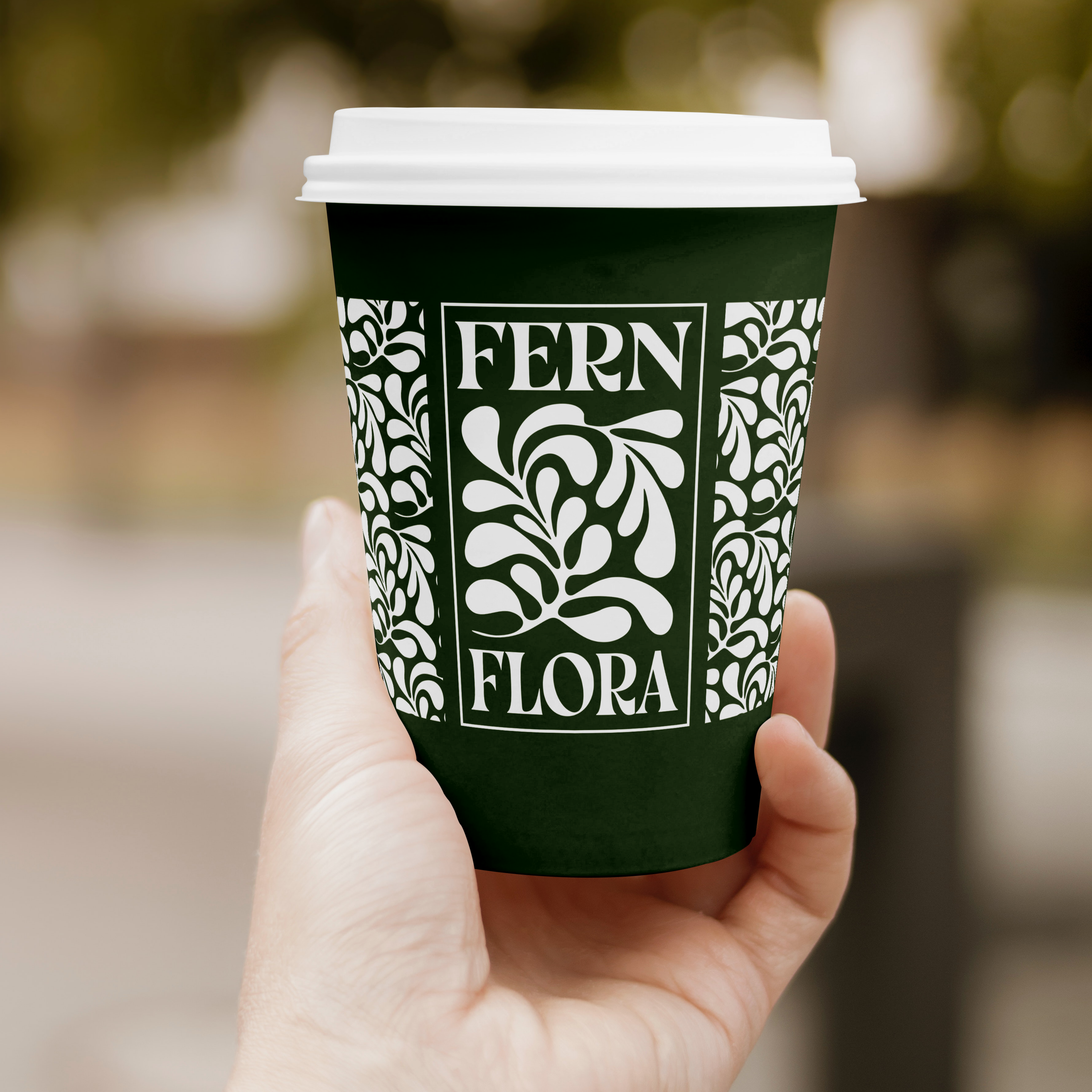 Fern & Flora est un brief fictif qui a été publié sur Instagram par @thecreativebrief.case. Il s'agit d'une boutique de plantes doublée d'un café cozy. J'ai donc imaginé une identité pour la marque et les goodies qu'on pourrait y retrouver : gobelets, tote bags, marque-pages.