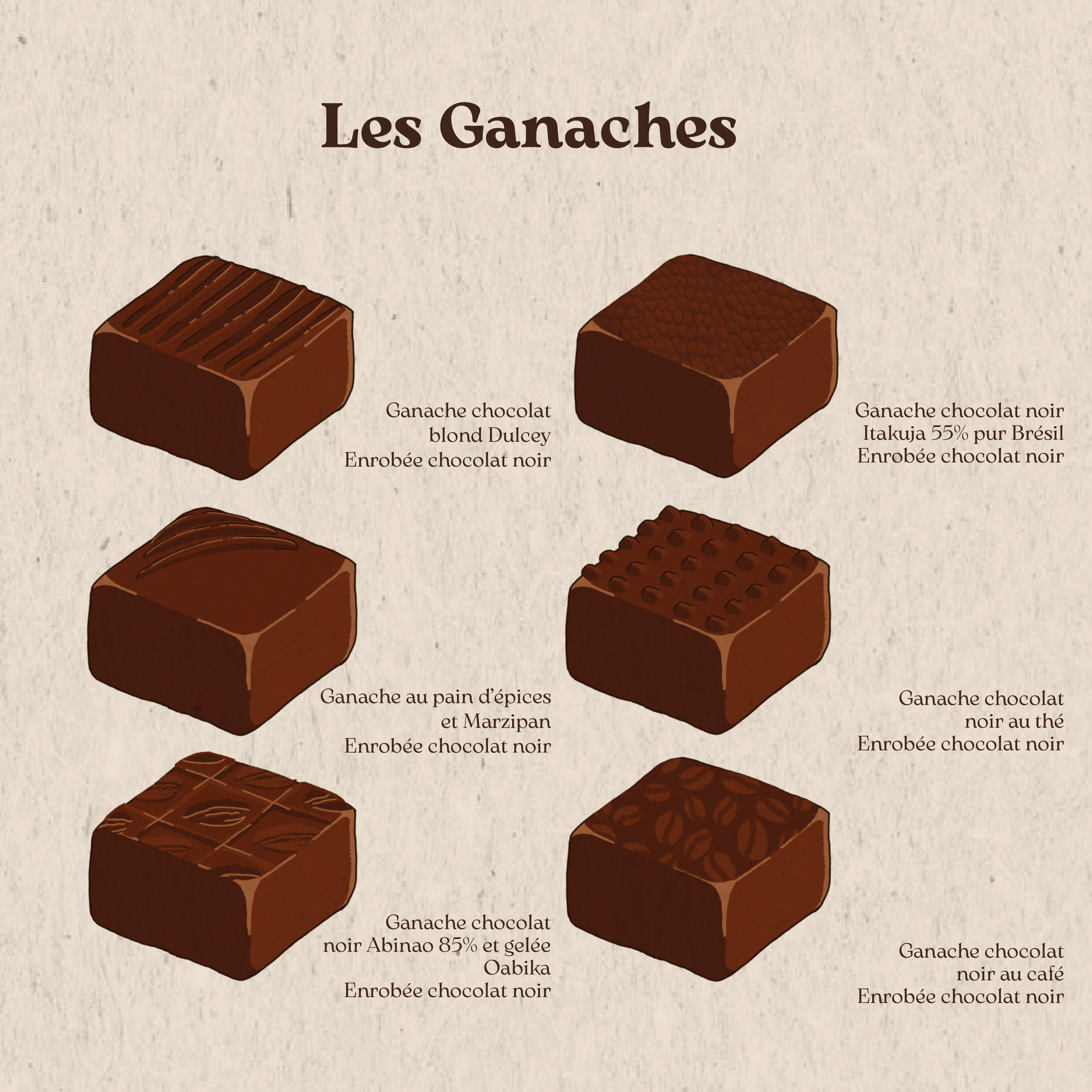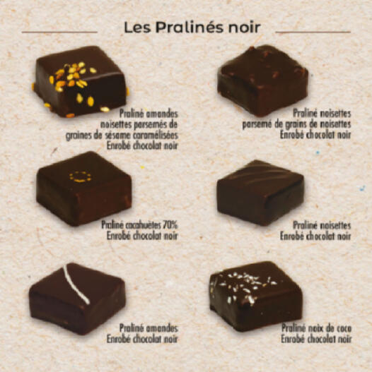 J'ai réalisé pour les propriétaires, Bruno et Cathy, un dépliant 10x10cm pour leurs bonbons chocolatés. Un projet intéressant, pour lequel j'ai réalisé une illustration de couverture, et une vingtaine d'illustrations de chocolats.