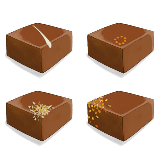 Recherches - Ci-dessous les fichiers avec lesquels je travaillais. Ils étaient en basse résolution, j'ai dû demander des photos supplémentaires de certains chocolats afin de voir leurs spécificités plus en détail. Mon premier jet a été jugé trop terne.